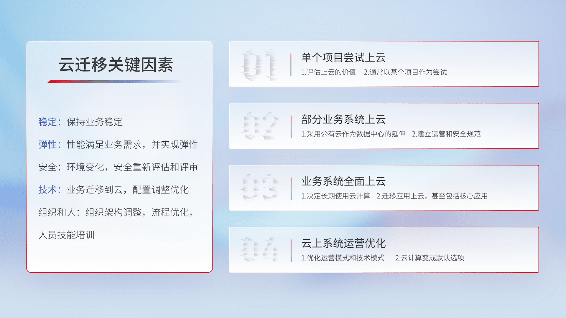 结合实际业务,,,,从规划设计、、、云平台选型、、、云原生改造、、、数据迁移、、集成交付,,迁移全过程为客户识别最佳上云路径,,做好风险识别管理,,,,设计网络架构、、、、身份权限、、、、安全审计合规、、、、操作审计、、、、日志审计、、监控告警策略、、、、多站点容灾设计等,,对云上基础设施进行整体规划,,提升IT治理水平,,以满足弹性、、、、高可用、、、、高性能的需求。。
