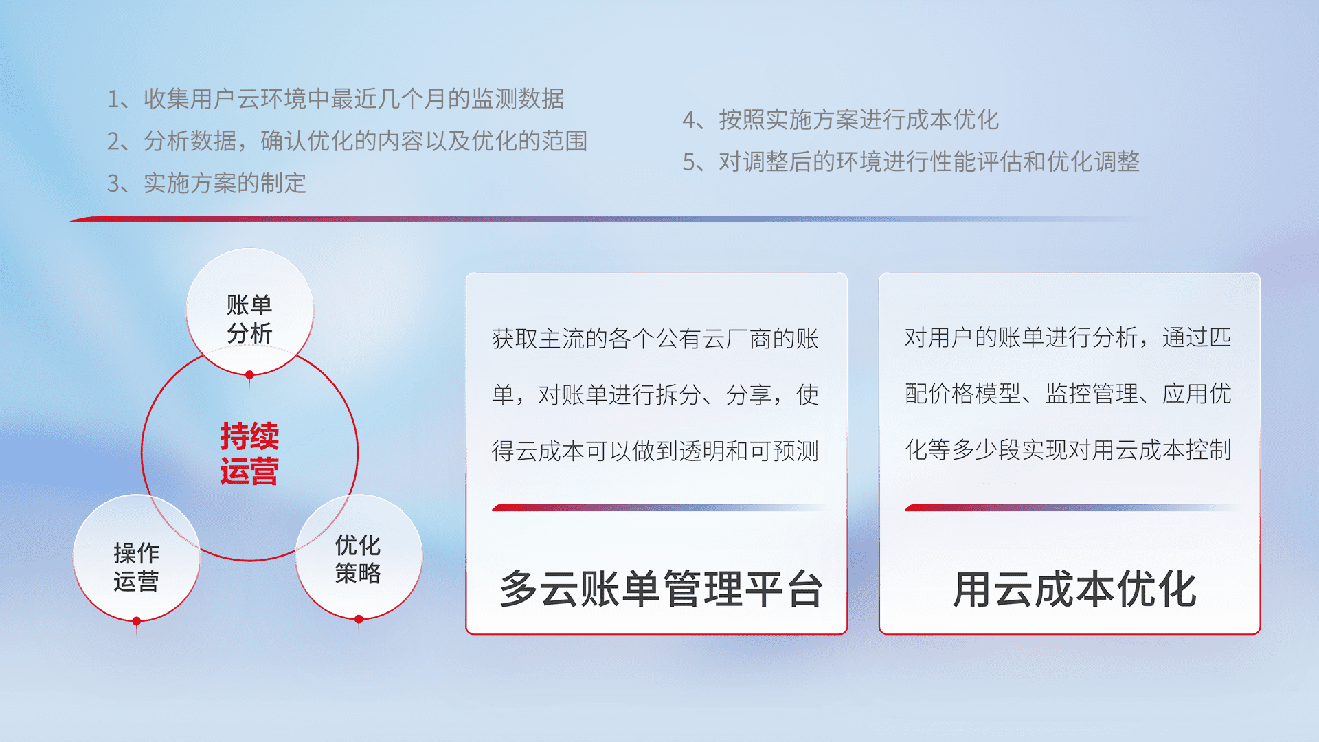 通过多云纳管,,以统一的资源数据模型把客户的云资源进行抽象和封装,,,进而实现对多云资源的统一操作,,,保障云资源管理的可靠性、、、稳定性与可用性。。。量身定制化运维内容,,配置、、、、开发运维、、、补丁管理、、备份、、、监控、、认证和访问管理、、审计和日常巡检等,,保障在用云过程中的可靠度,,,,稳定度以及高可用率。。。