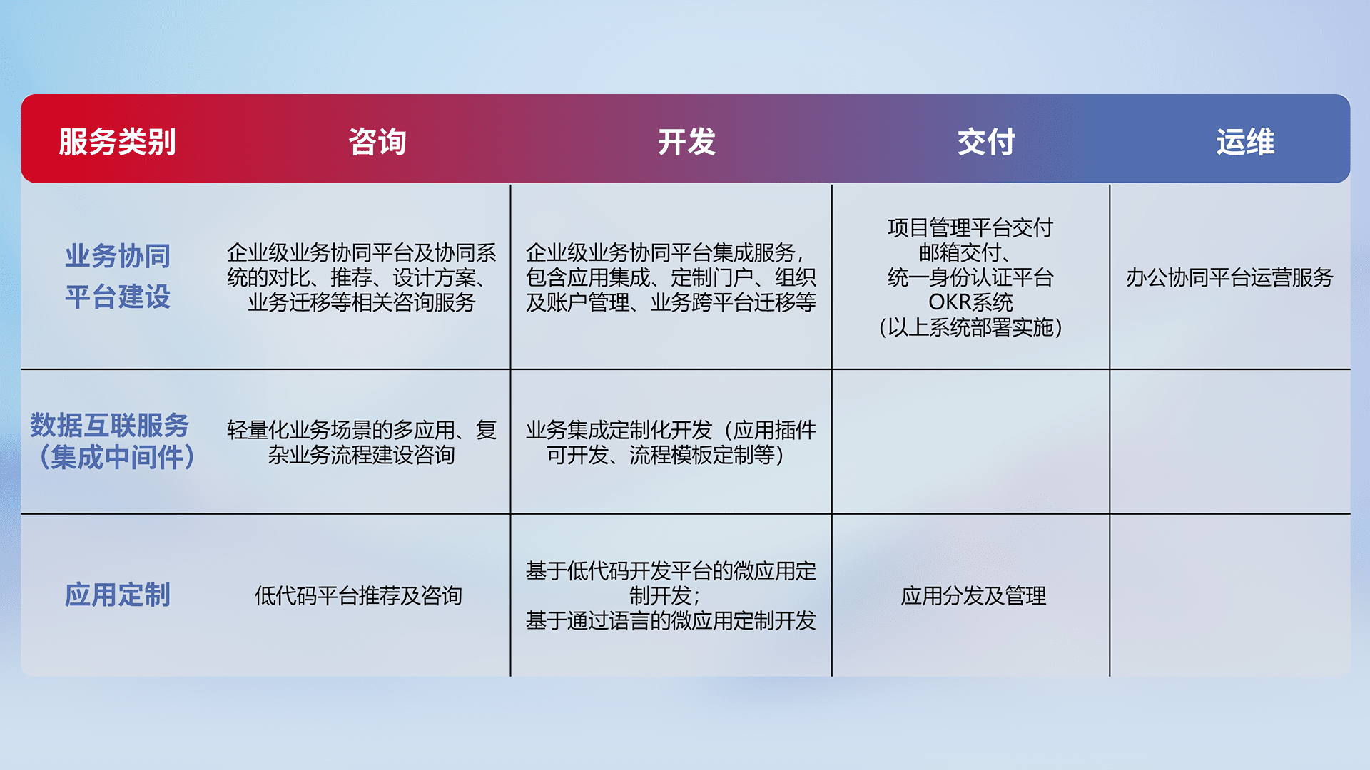 针对钉钉、、、企微、、IDaas等平台级产品提供产品的规划、、、、方案、、、、交付、、、、定制化开发等服务,,,,实现如统一协同办公、、、、智能客户服务、、混合会议管理、、智能数据查询、、、等业务场景,,实现数字化转型。。